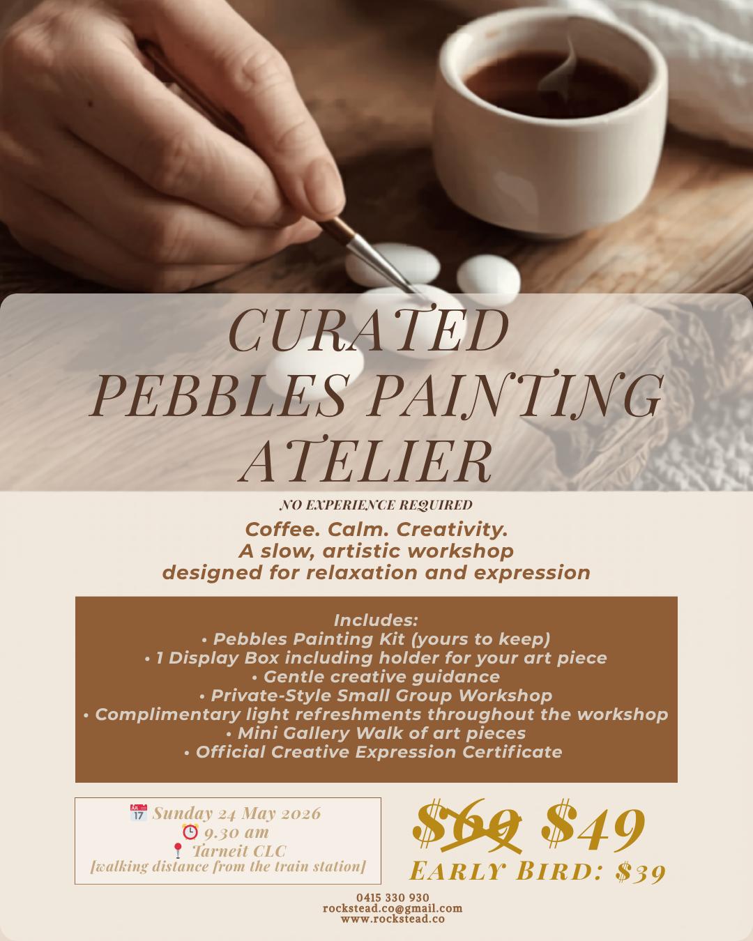 Pebbles painting kit yours to keep, guided creative session, light refreshments, mini exhibition moment, and certificate.